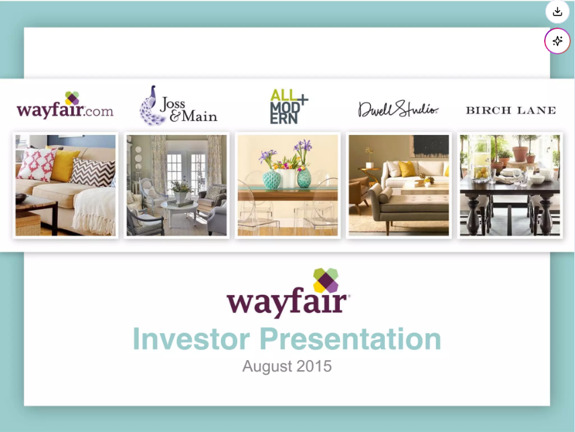 Wayfair is an American e-commerce company specializing in furniture and home goods. This investor presentation is well-structured, reflects the brand’s style and colors, and provides key information for investors, including market growth, market position, and Wayfair’s unique strengths.