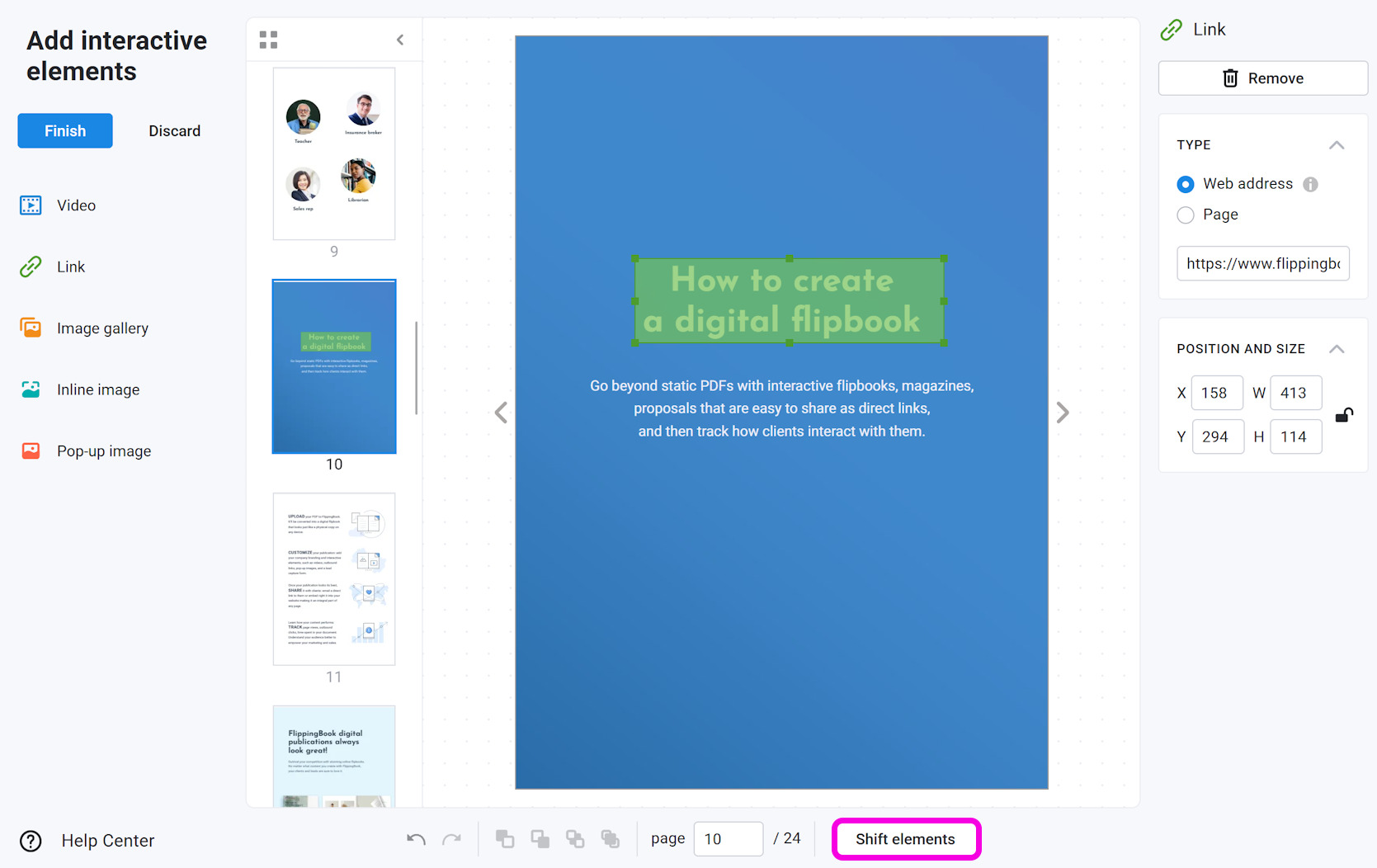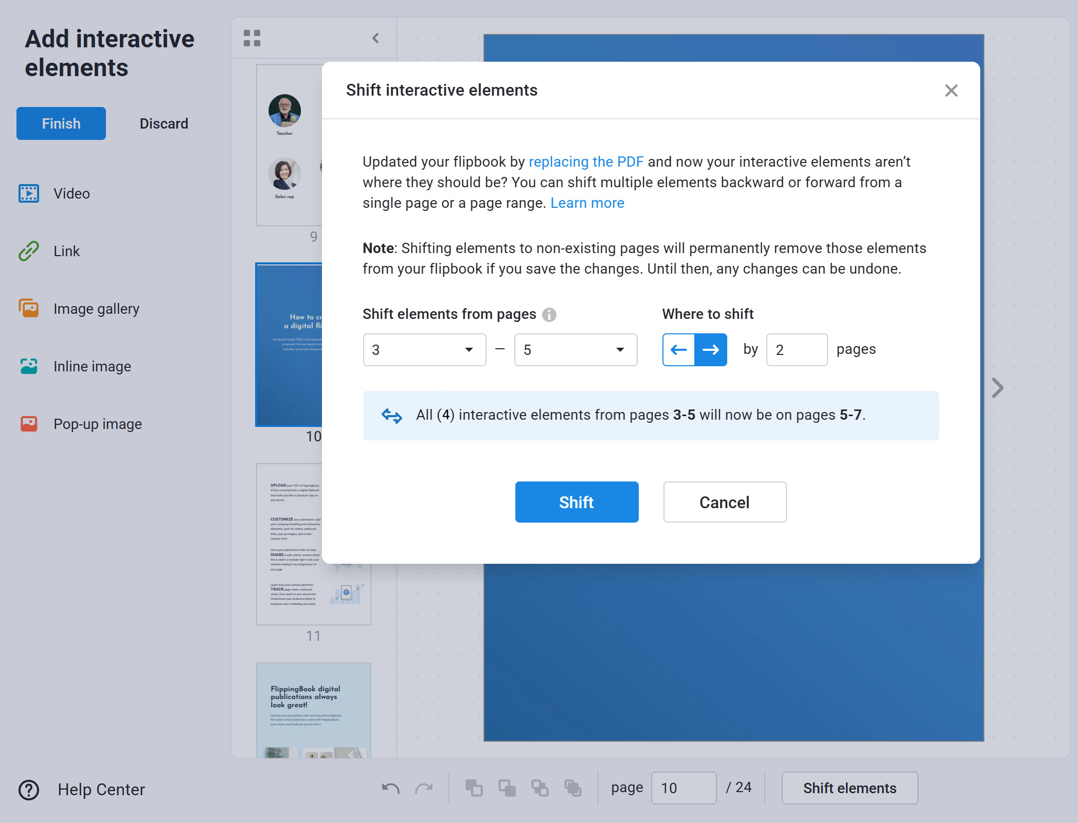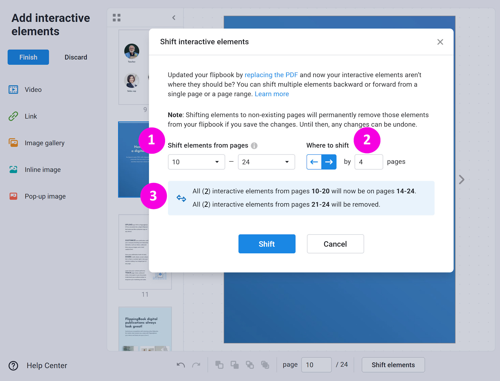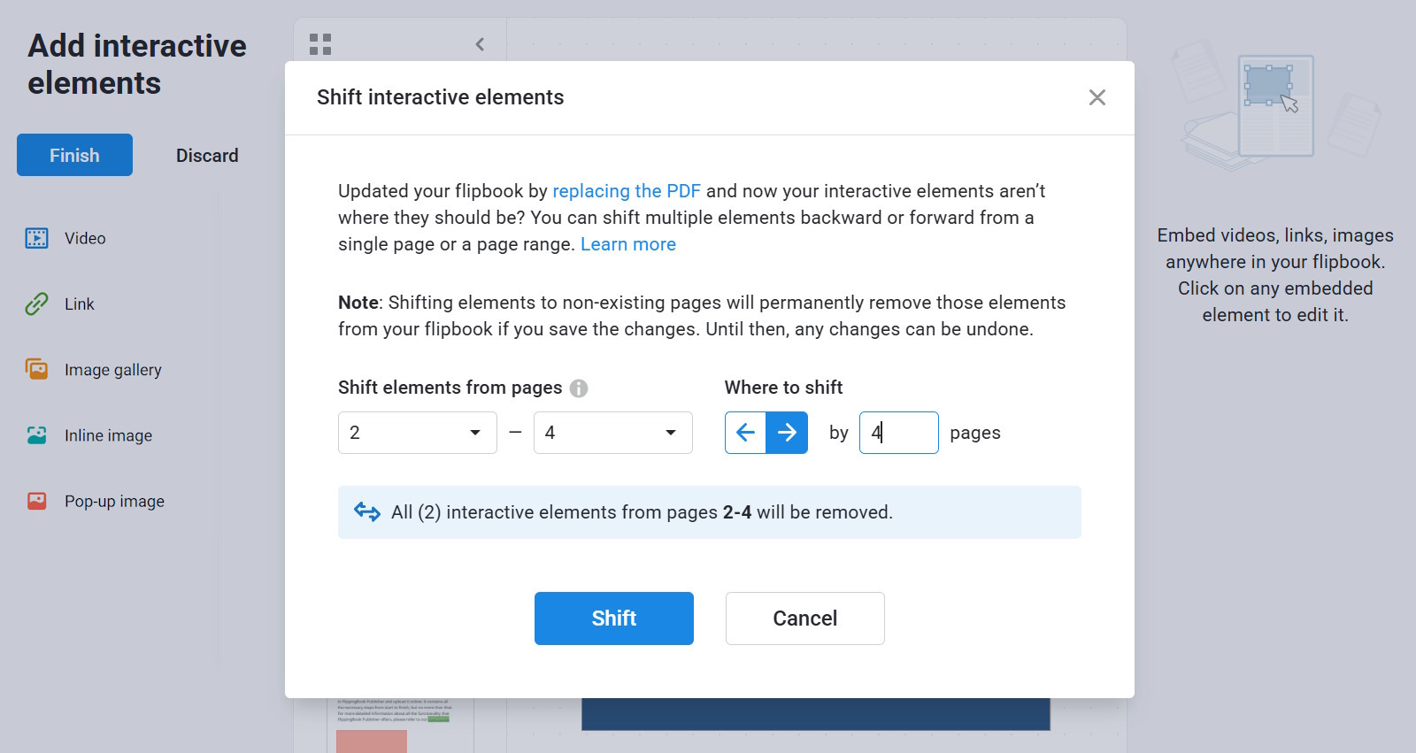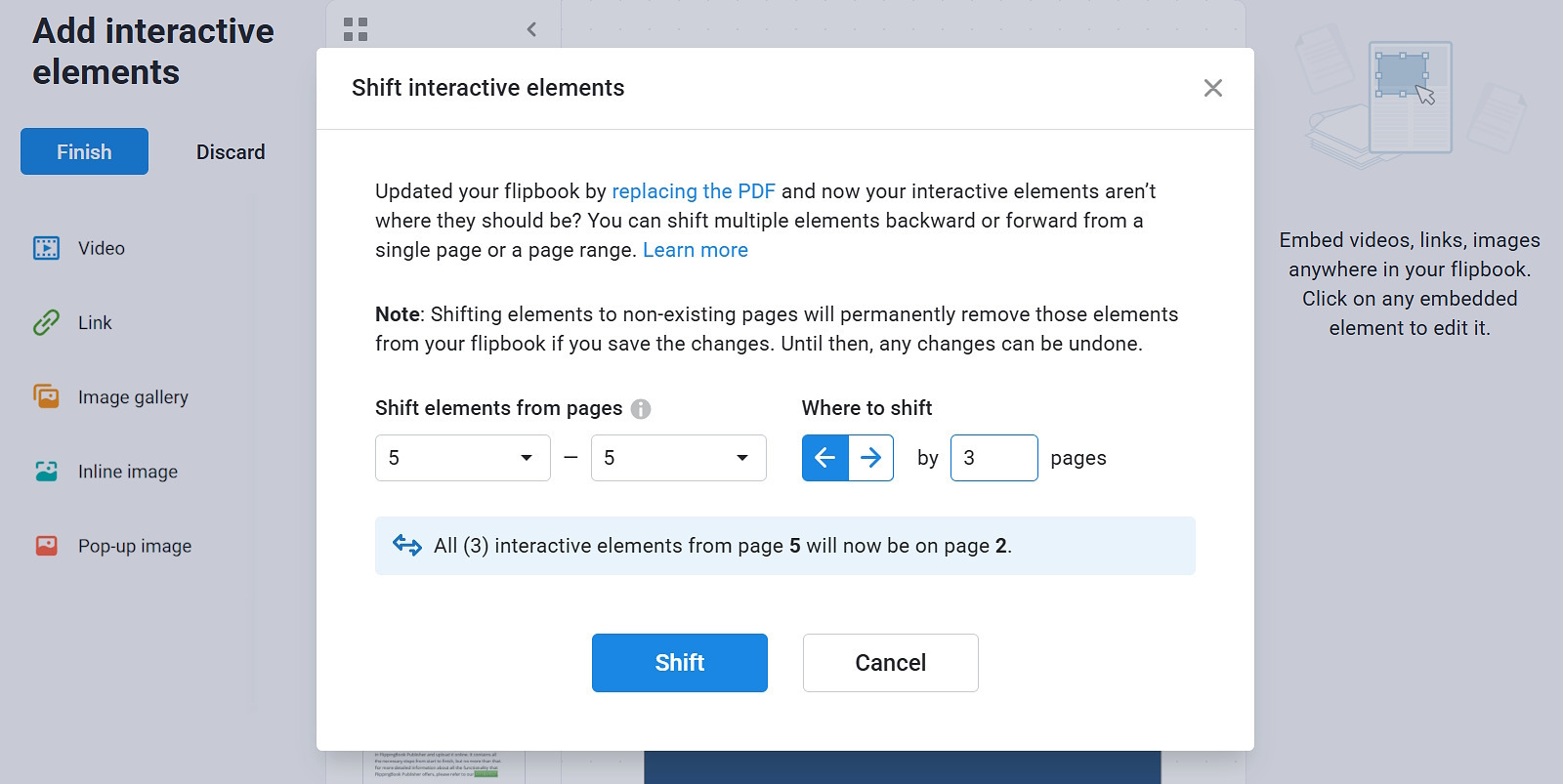 Shift Elements is a feature that allows you to move any content you have added to a flipbook (such as videos, links, images, etc.) in bulk by one or more pages. The main reason for doing this is when you add custom content to your flipbook and later replace the original PDF with another one. If you added or removed some pages from the new PDF, your added content elements can end up on the wrong page.