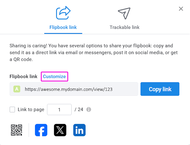- You can replace the online.flippingbook.com part with your own custom domain. You only need to do it once.