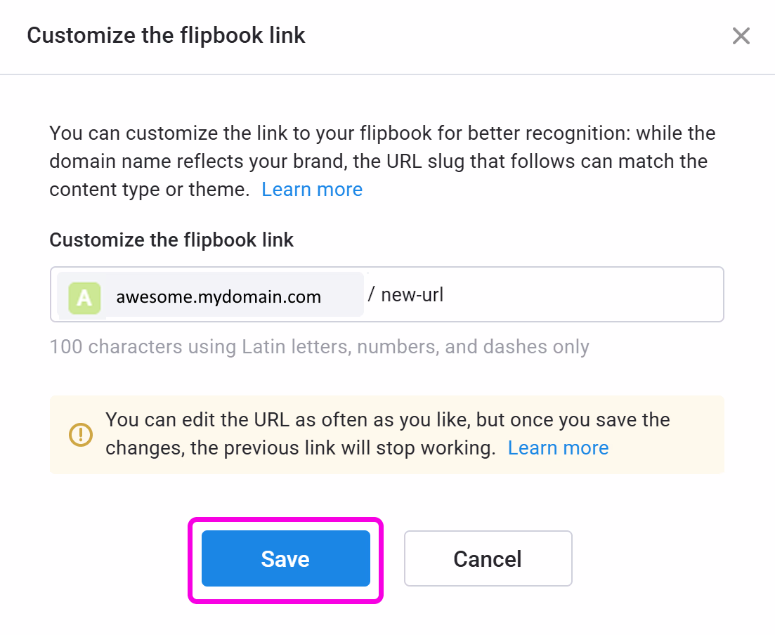 - In the URL field, enter the name you want for your flipbook. Use only Latin letters, numbers, and hyphens.