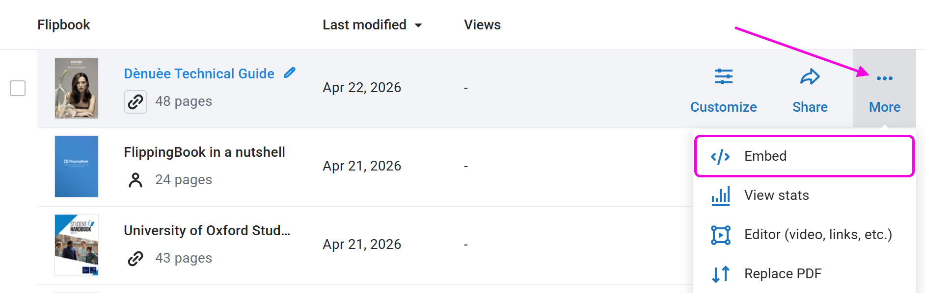 - Hover over your flipbook and select Embed or find the option in the More menu.