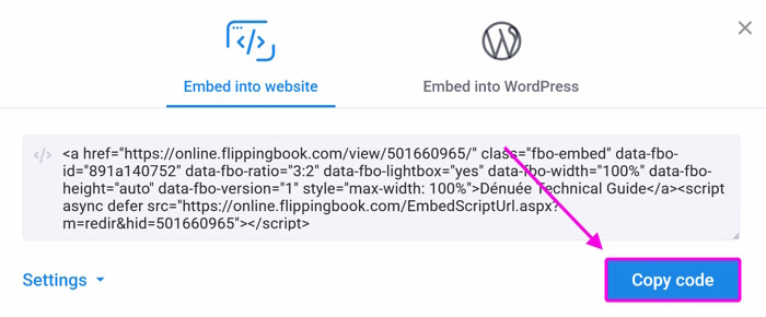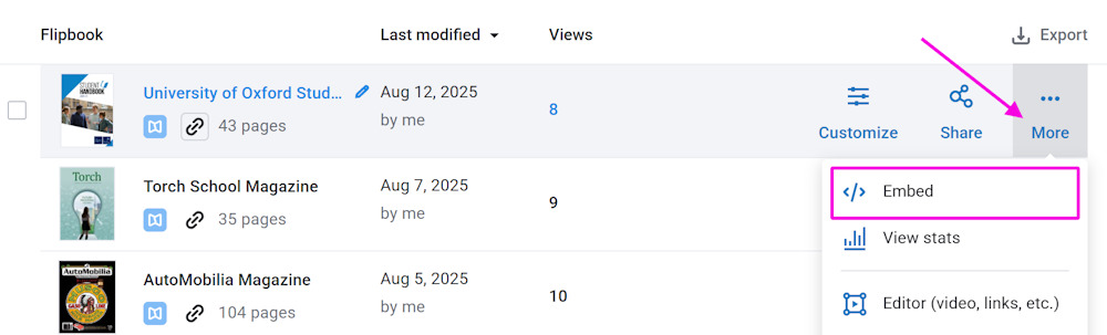 - Hover over your flipbook and select Embed or find the option in the More menu.