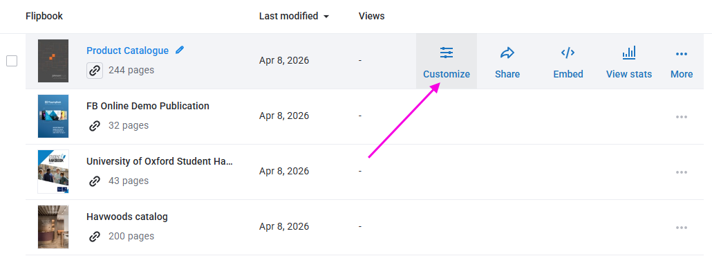 2. Hover over the flipbook you want to change and click on the Customize button.