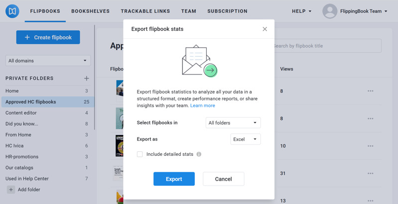 2. The Export flipbook stats dialog will open. In the Select flipbooks in setting, you can either keep the current folder or include All folders in your report.