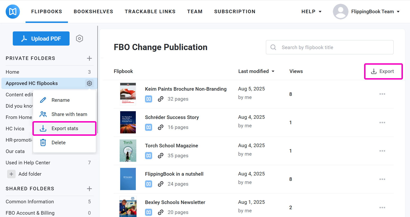 If you want to export a report from your Home folder, click the Export button next to the list of your flipbooks.