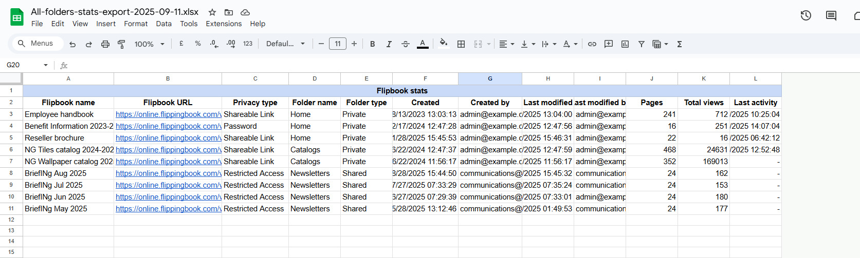 You can decide how detailed this report should be based on your needs. It can either give a simple overview of all your flipbooks (name, privacy type, folder name, creator, and creation date):