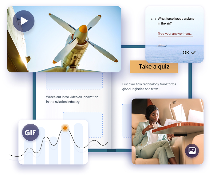 Haga que su catálogo sea interactivo añadiendo vídeos, enlaces a páginas de productos, GIFs animados e imágenes pop-up.