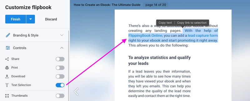 You can find the Controls section under the Customize tab of your publication. This section lets you choose which buttons and panels your readers can see. You can choose to show or hide various options, such as text selection, search, adding notes, or allowing them to download or print the original PDF.