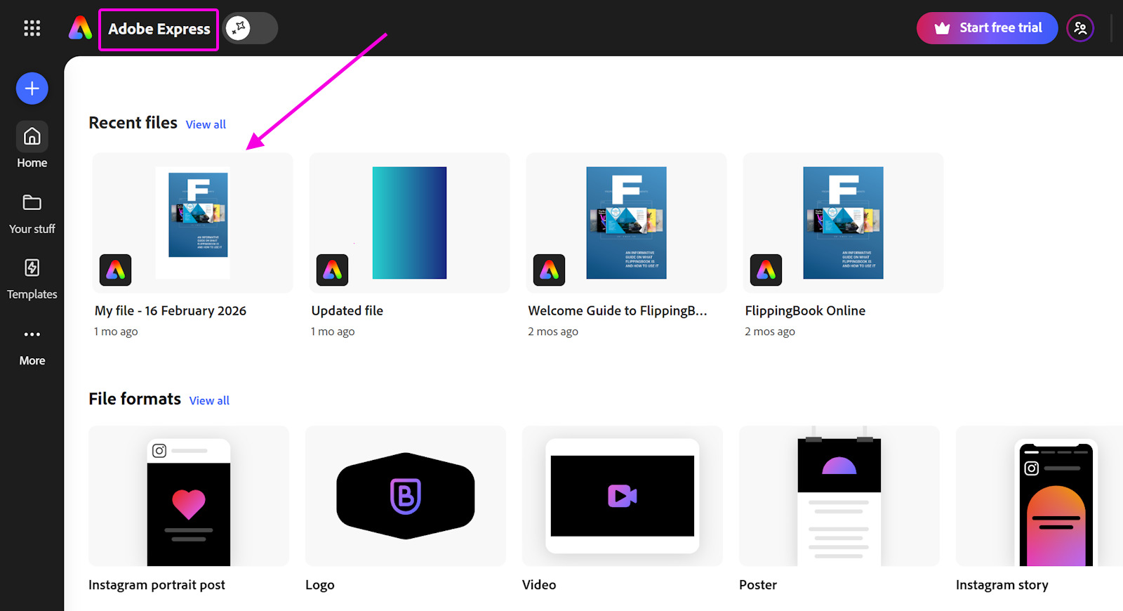 - Open your published file by clicking the Adobe Express link in the top-left corner of the page and selecting the file from Recent files:
