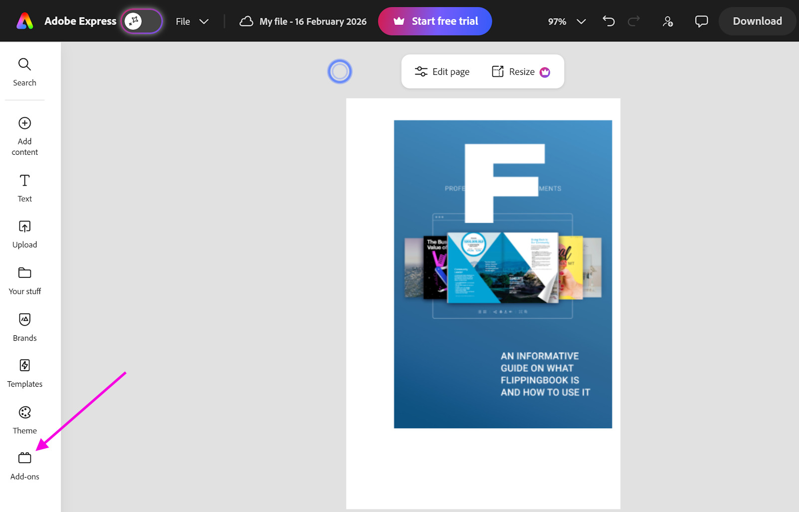 - While working with your Adobe Express file, click the Add-ons option in the menu on the left-hand side: