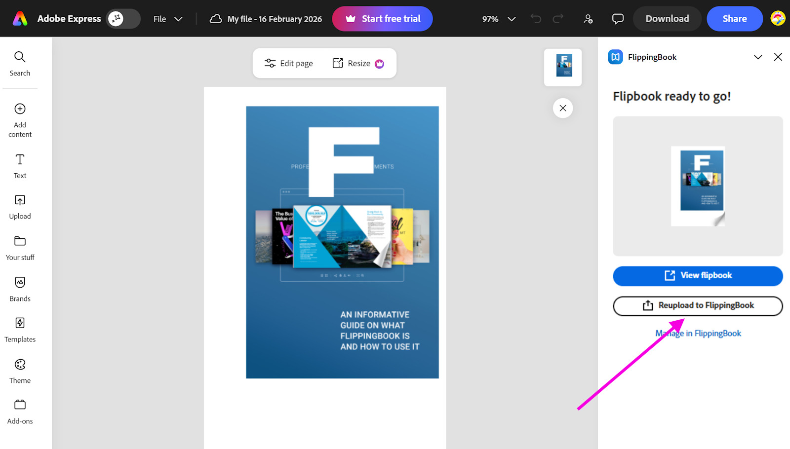- Reupload to FlippingBook updates your flipbook once you make changes in your original Adobe Express file. The option is available from the Starter plan and higher.