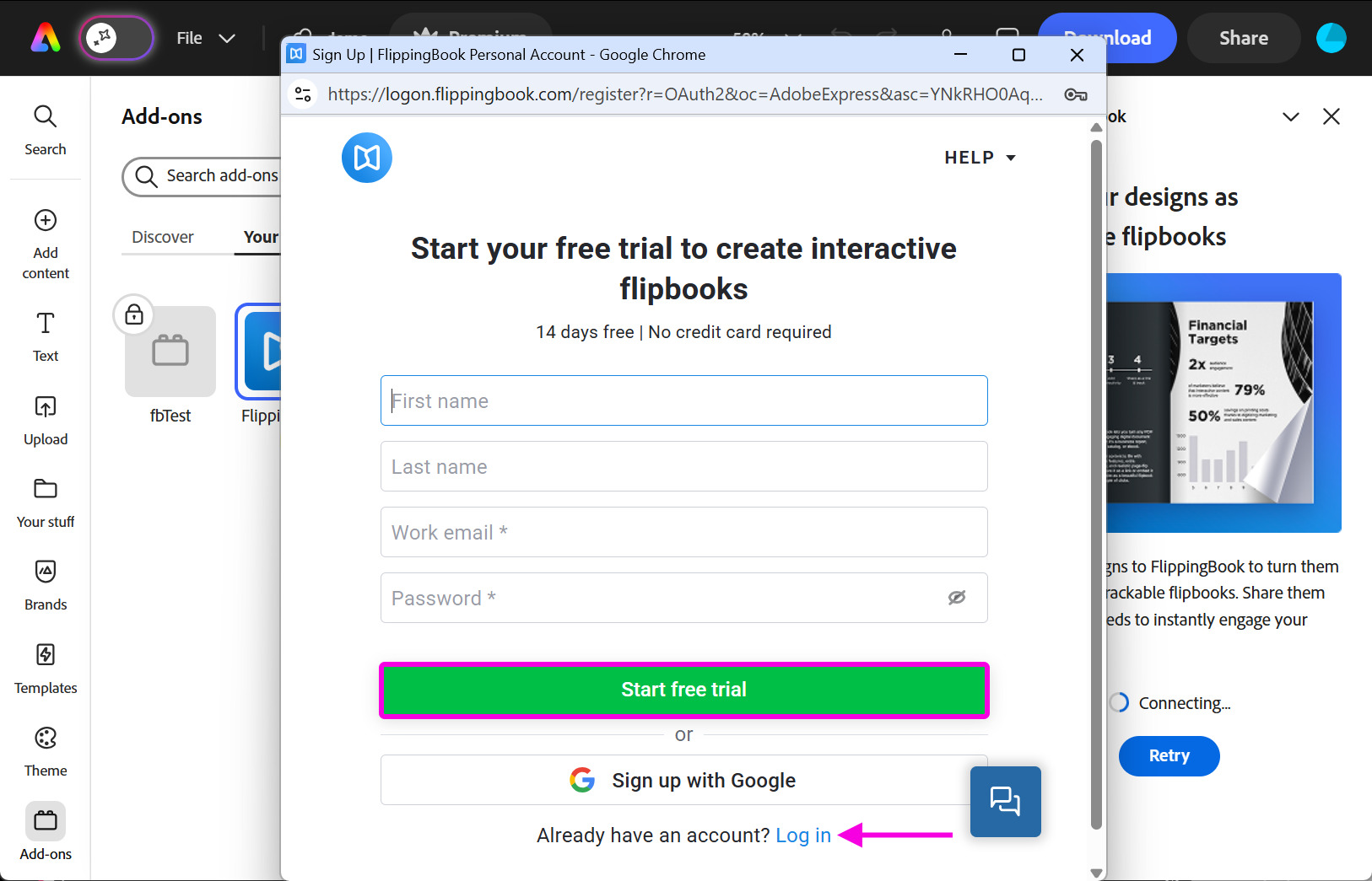 - In the pop-up window of the application, log in to your FlippingBook account using your credentials, or create a new account by clicking Start free trial:
