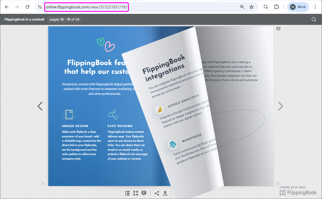 - View flipbook opens your flipbook in a new tab of your browser. You can copy the link there and share it with your customers.