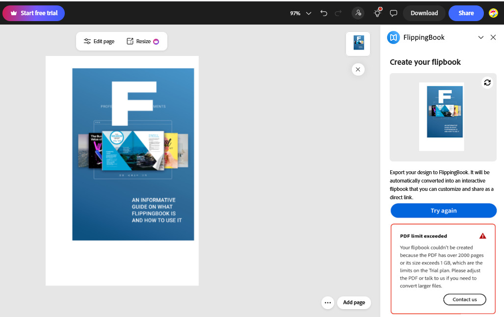 - If the flipbook couldn’t be created because the PDF file size exceeds the limit, try optimizing your PDF using an online service such as Smallpdf or Adobe Acrobat Pro. We explain this solution here.