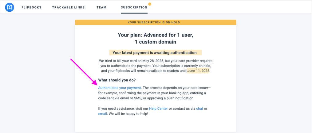 If you pay for your FlippingBook Online account by credit card, our attempt to charge the card may fail. When the payment fails, your FlippingBooks don’t immediately go offline. We put your subscription On Hold for a 14-day grace period. Over the next 14 days, we will attempt to charge your card multiple times. We will also reach out to inform you that the charge has failed. There are two scenarios: