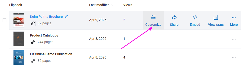 - Hover over the flipbook you'd like to change and choose the Customize option: