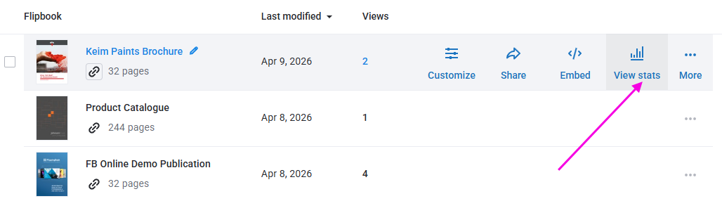 - Hover over the flipbook and choose the View Stats option: