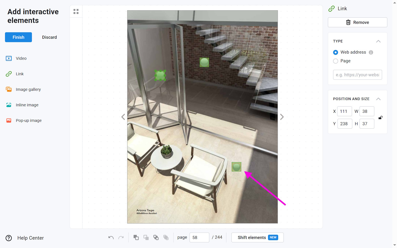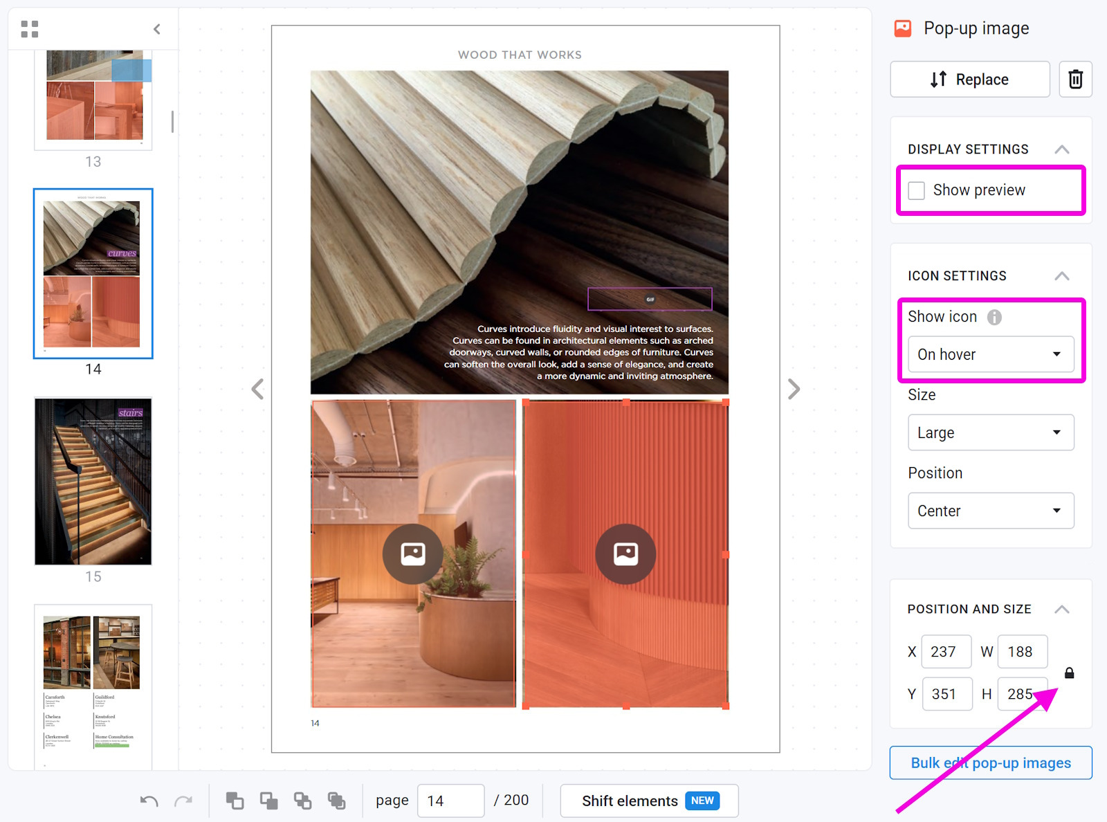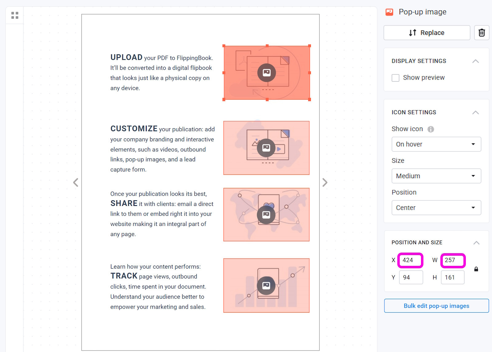 By default, we add icons to pop-up images to help your readers notice them. You can change their size, position, and behavior in the Icon Settings section. If you need some additional info as to how they work, have a look at our article Icon settings. If you want to change the settings for all the images in your flipbook, then our Bulk change option is for you!