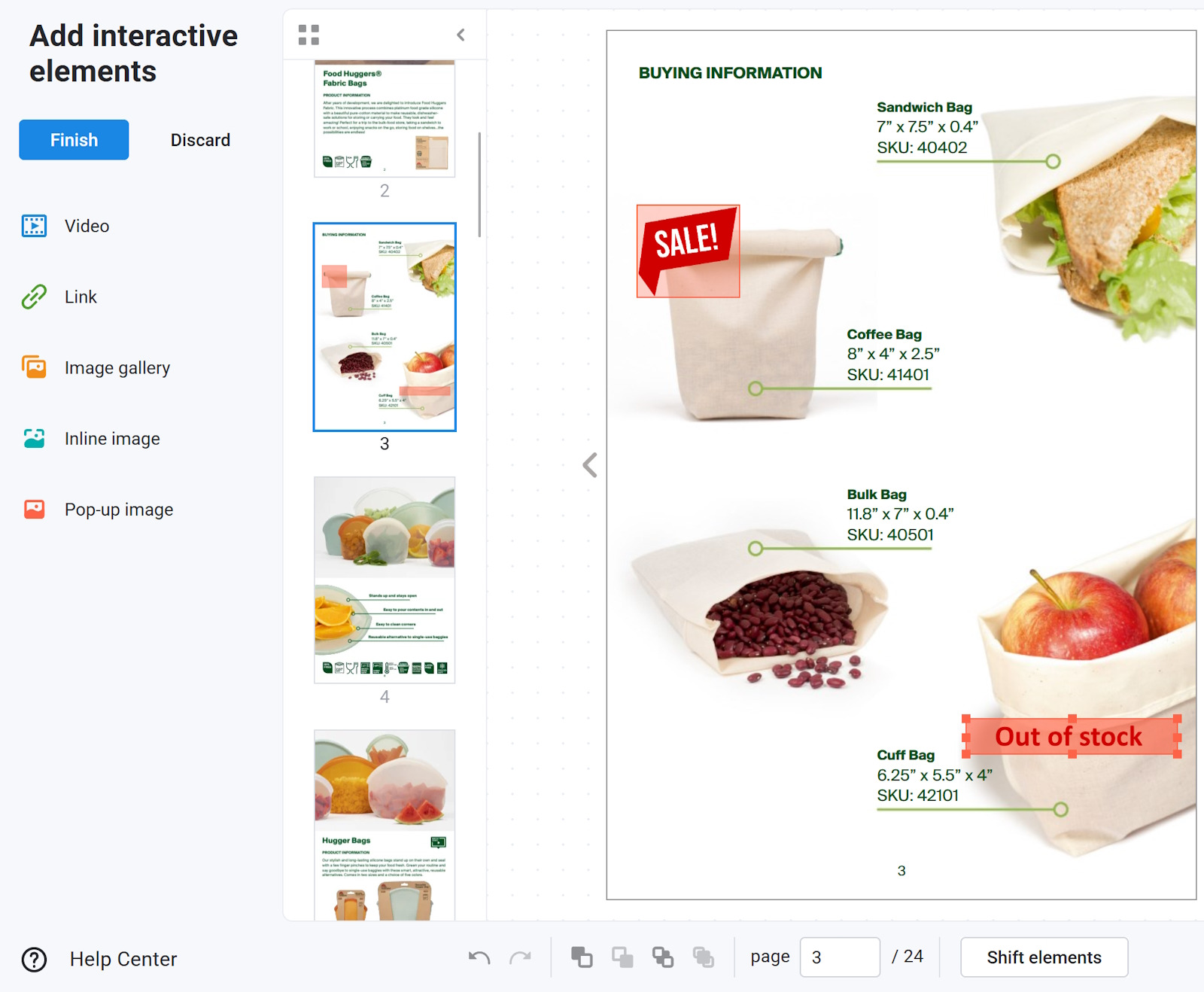Another great use case is to add transparent images. For example, if you create a catalog for a whole year. Invariably some of the items in your catalog are temporarily out of stock, or part of a promotional sale. Using transparent images is a great and easy way to let your reader know about that.