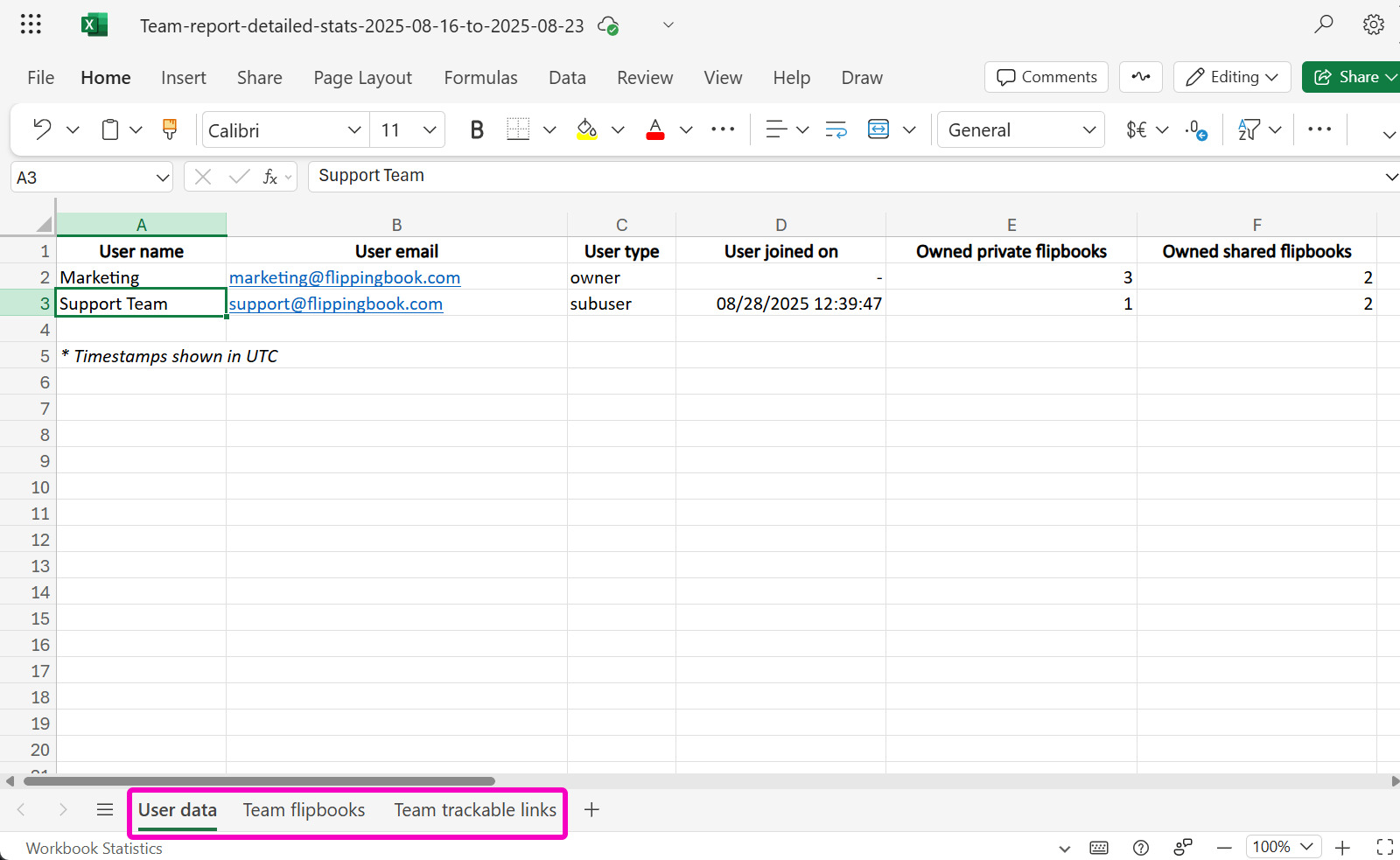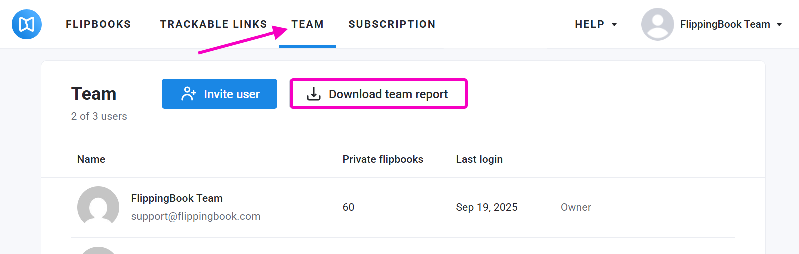 If you use FlippingBook Online Team or Enterprise, the account owner can download a team report. This report consists of three different sheets and includes the following information