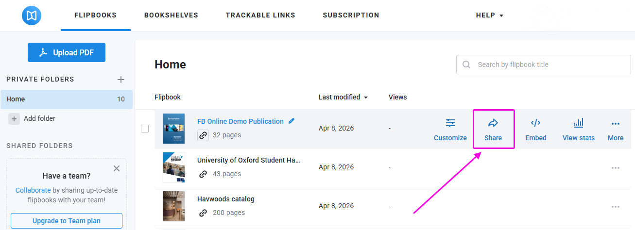 To create the first flipbook, you can upload one of your own PDFs or use a demo PDF.