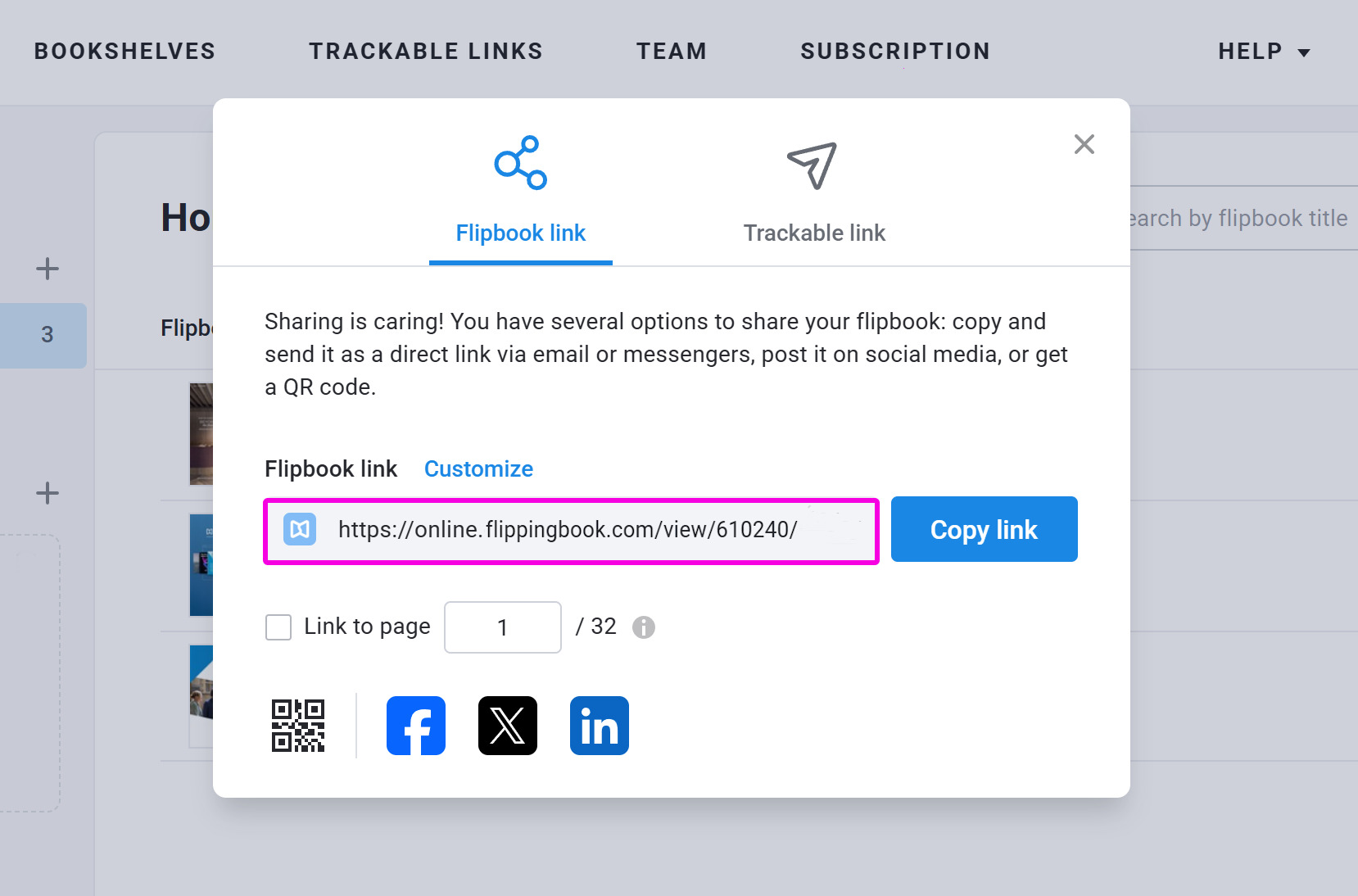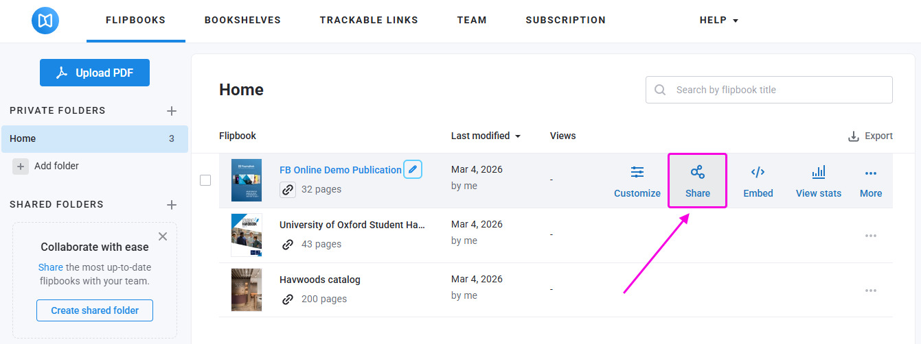 - Hover over your flipbook and click Share.