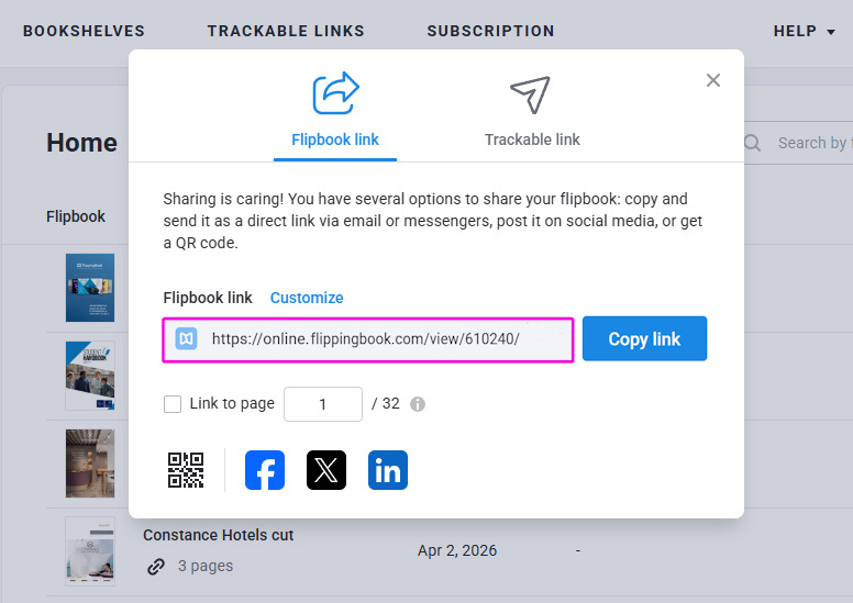 - Press the Copy link button to copy the link to your flipbook. You can paste it in e.g. an email to a colleague, in a messaging app, or even in a social media post. If you want to preview it yourself first, just paste the link in a new browser tab. This way, you can check what it looks like before you actually send out the link.