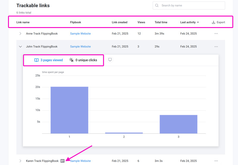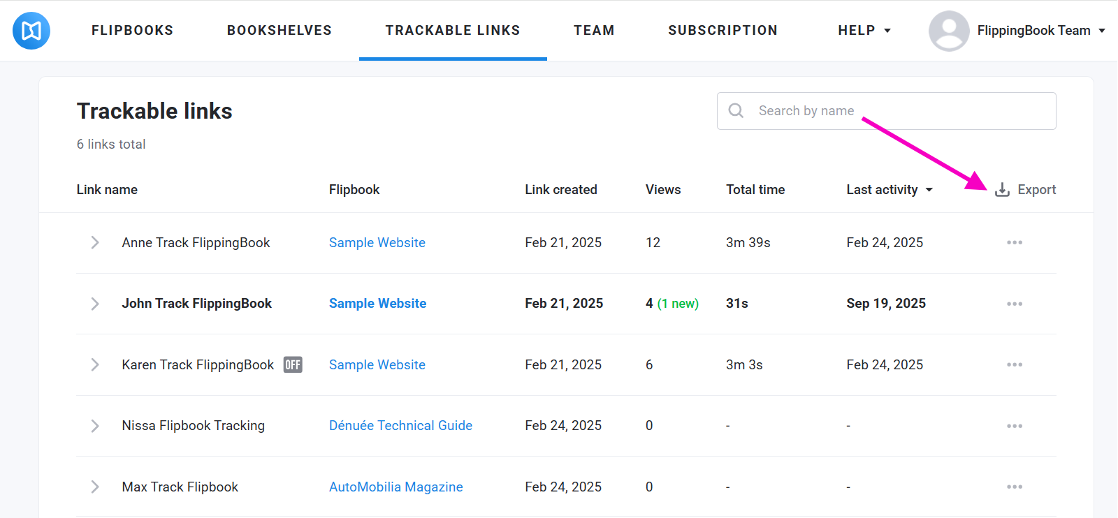 These reports are helpful to understand and analyze how your links perform, and exporting saves time and minimizes errors. They contain all the information you see on the main screen (Link name, Flipbook, Date Created, Views, Total time, and last activity). In addition, you will find:
