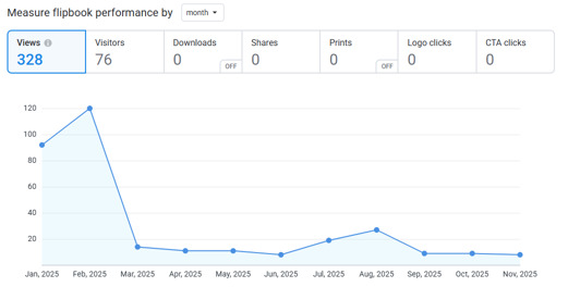 - Built-in Stats - See how many people viewed your flipbooks and how often - either per flipbook or download a full report for all your publications! Advanced plans even include page-level stats and geo-stats.